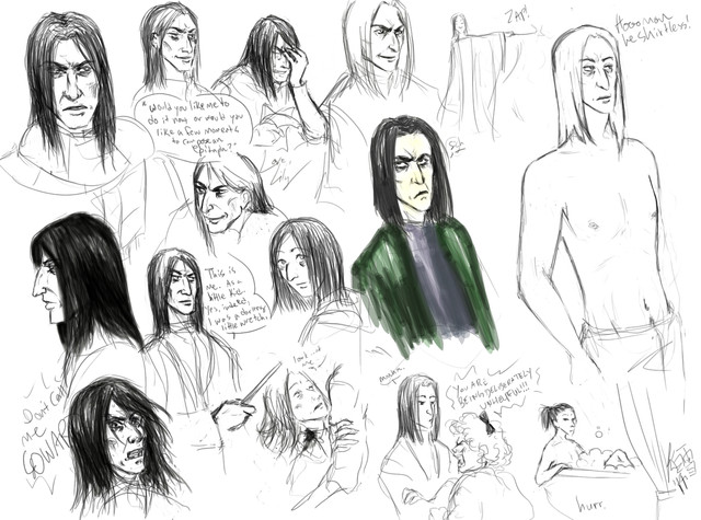Some sketchy sketches because I'm all excited about the movie tonight. These are kind of me trying to figure out how to draw him the way I picture him, so there's some variation and some borrowing of other people's styles, it's kind of obvious whose. He's kind of a hard character to draw... ugly yet charismatic. Drawing the line between too hot and too revolting/creepy, that's the hard part in drawing Snape. D<Ahaha, that smiling picture is so creepy, orz.