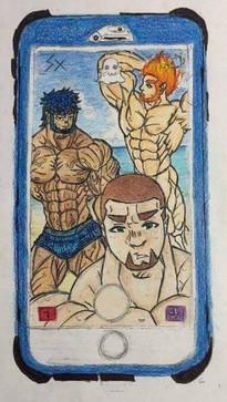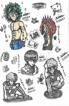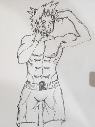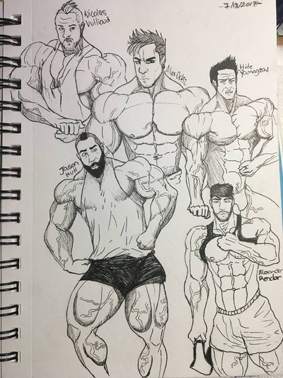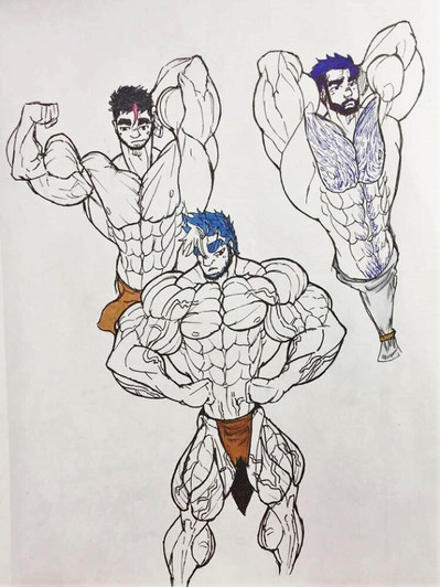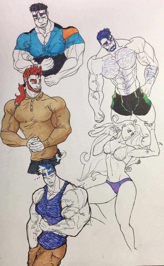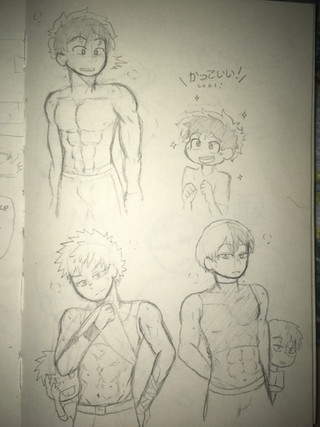 Fan art I did of a few characters I like from the anime and manga: Boku no hero academia/ my hero academia (of course I drew them all buff up because why not lol, I like muscles, could say in a adult version of them )Todoroki, Iida, Deku and All Might buff form with a posing speedo