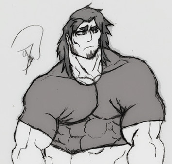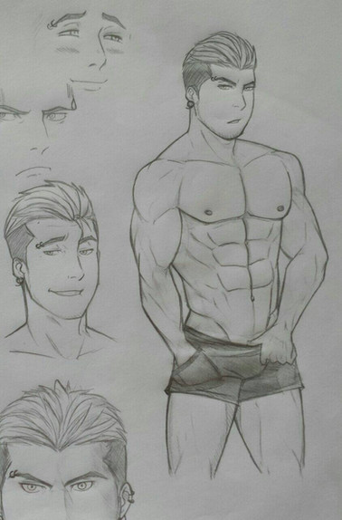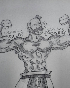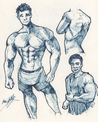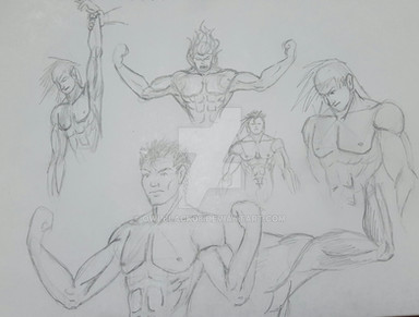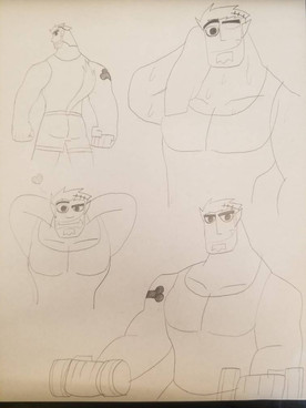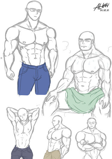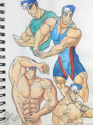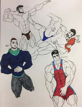few of my characters in the same pagekeiji suji, big blue, big red, ( girl that don't have a name for now ) and blue shio, doing a muscle growth and bicep flex.