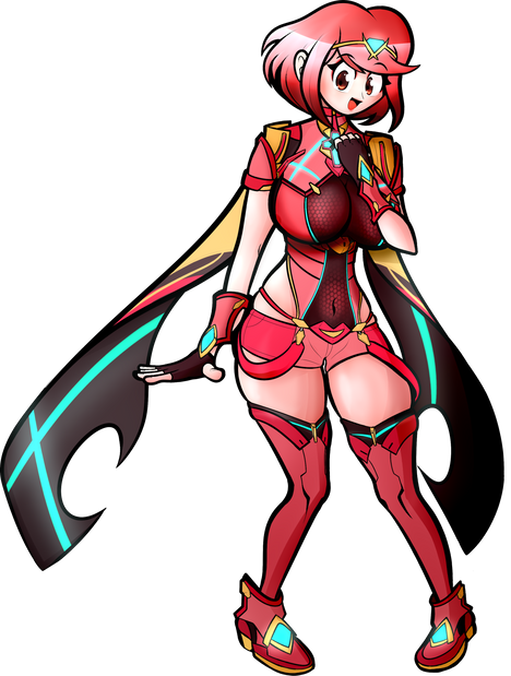 A legendary Blade known as the Aegis, Pyra wields the power of fire. When Rex finds her core during a salvaging mission, Pyra awakens and bonds her soul to his to save Rex from death. Kind-hearted and strong-willed, Pyra vows to protect Rex in the same way he swore to protect her as her Driver. Pyra is a split personality of Mythra, who awakens after a near-death experience and eventually learns to work with Rex and swap between Pyra at will. Eventually, Rex's willpower and drive to protect the both of them lead to them gaining their own separate bodies.