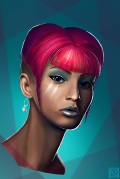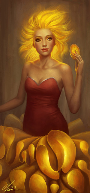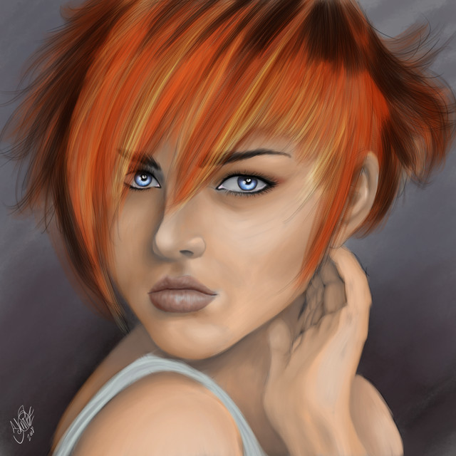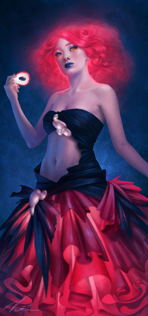 I absolutly love this painting *A*. I like the more rough colouring style and the colours in general are really gorgeous. (amg red hear I wants QAQ). Her expression is also beautifull