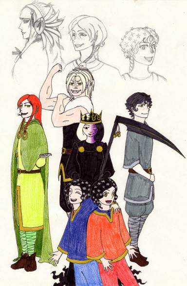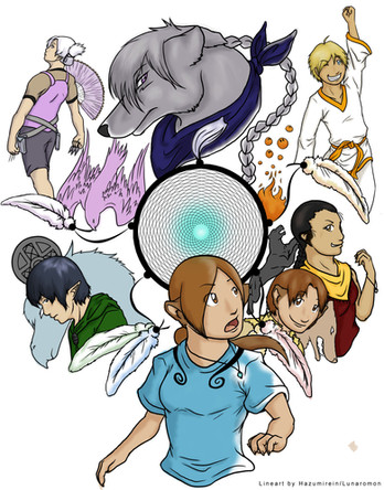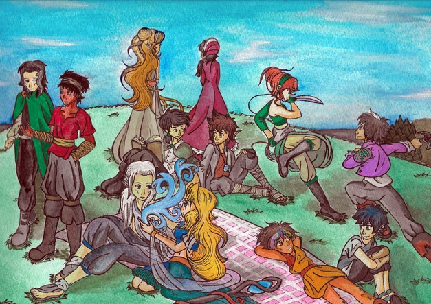 Now, about the drawing of which I'm proud... kinda! The blong girl on top of the tree is Ramy, the boy next to her with the brownish hair is Julián, the next one with the black hair is Ryushi, the girl with the bag of chips and black hair is Tahagame, the blond guy down is Sahayanu and the girl with the brown hair is Mayi. In Julián's shoulder you can see the little Tiki, Ryushi has Hetgi in his lap, Rocky is savoring th bag of chips, Mitomi is looking at Lomi, Nala has her head leaned on May's knee and Muca is sleeping in May's other leg.