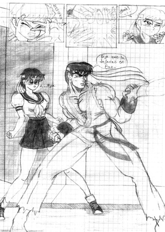 Este dibujo me costó algo de trabajo, sobre todo el perfil de Sakura, pero siento que quedó bien, apegado a mi costumbre, este dibujo está en blanco y negro.Jejeje, personalmente me gusta la situación, Sakura intentando robarle un beso a Ryu quien está acorralado.