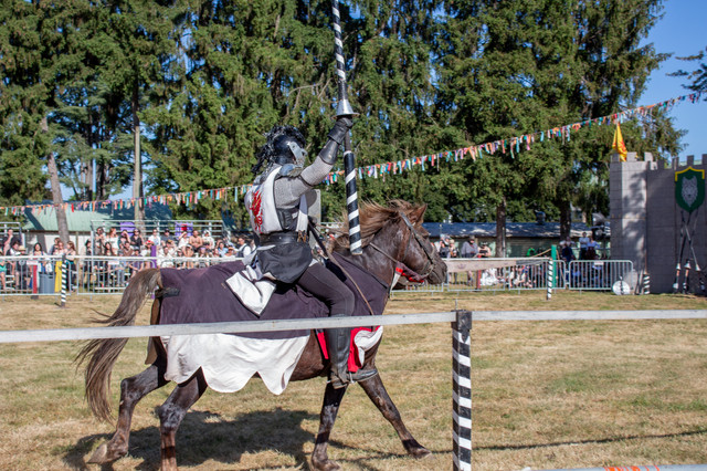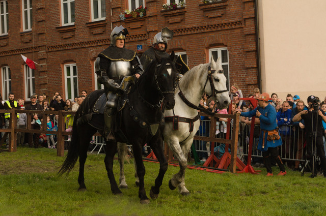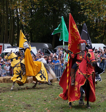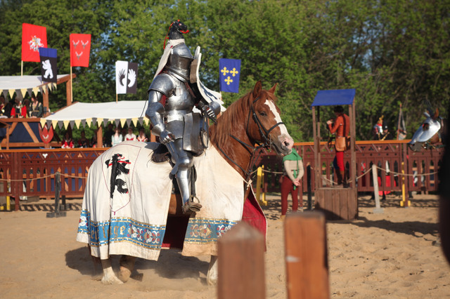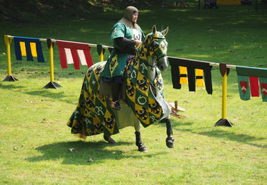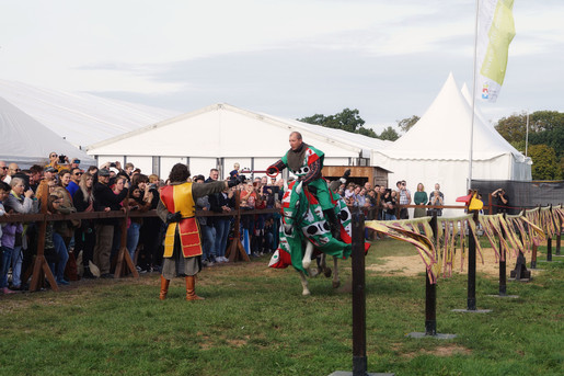 Impressions from the Reenactor Fair in Minden 2023.A standard exercise for all who want to fight with the lance. Hitting the shield with a practice lance. In this case represented as a tournament, where each knight must aim and hit his half of the shield. The first one to hit it wins.