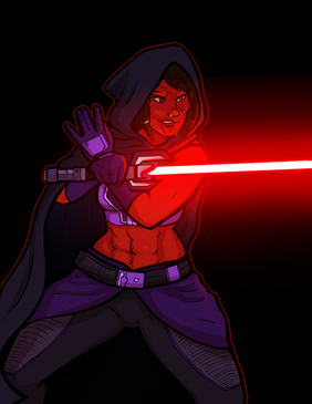 And of course, the lightsaber would've made sense, too! But she was going for a straight-in finishing stab in this picture, not a downwards slash. (And the reference pose had the sword pointed that way as well, heh.)