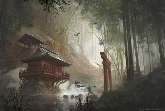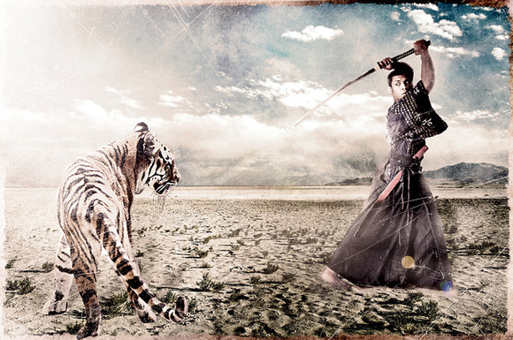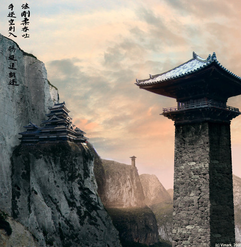 This is simply a beautiful piece of work. The building amidst the tranquility of the forest speaks for itself: a place where ultimately the warrior's spirit is refreshed and conditioned for a more peaceful state of mind. At the same time, the tiger walks across the steps, representing ferocity and determination, but because it is not attacking, merely going about it's routine, it is not a violent art, simply choosing to let others do as they please and only defend itself if absolutely necessary. Simply beautiful.