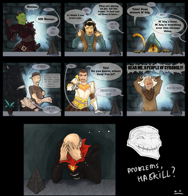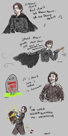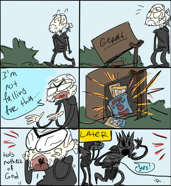 Little rough draft I did of an idea I had for a comic strip about witcher 2. Tell me if you can get whats going on from the visuals. The joke is based on the doors in the game. When someone opens a door infront of you it just closes shut after them and you have to reopen it, and theres quite an unintentionally amusing sequence when you're running with Roche to go to a meeting and you have to go through a load of doors and he just slams them shut straight in your face the whole way there, which is what I'm trying to show here.Still rough (and wonky) but it's just a little gag comic, if people liked it i'd work on it more but if no one finds it funny there's no point