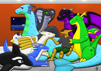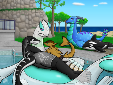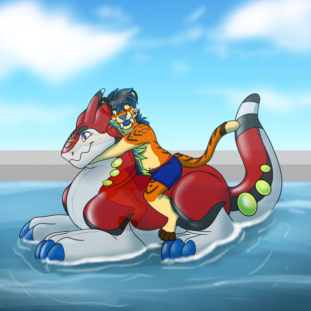 Another sunny day at Wullf Manor in Verenia. And also a day well spent! What's better than cuddling your favorite thick eldritch sergal on top of a squeaky sea dragon who's more than happy to give rides! Chances are by the time the sun sets, they'll be passed out in each other's embrace. Unless of course they decide to have some more exciting fun~Extra thicc serg belongs to