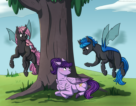“Oh hey, where did you come from?” He heard a voice above him and as he looked up he saw the face of a light blue filly hanging upside down with her head poking out from the leaves. Before he had any time to respond the filly gasped and spoke once again “Did you teleport here? It’s so neat when ponies do that. I like how it looks like a bright firework when they poof away”
