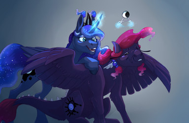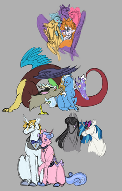 Trixie loves doting on Tempest and constantly tells her how much she means to her and give her love pecks as much as she can. Tempest is more reserved in her affections and tends to allways stand close to her small girlfriend or hold her tight when they sleep.