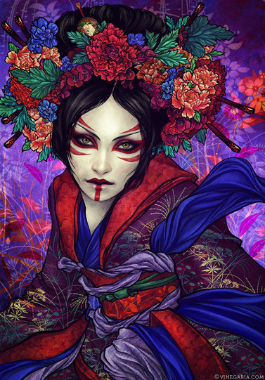 Those of you following my blog at vinegaria.blogspot.com/ already saw this one. It was done over a month ago for a school project. Though I do love this theme and been reading about whole geisha culture since many years (I'm known to collect hundreds books about this topic). I wonder why I actually have so few pictures showing this.. Well, maybe that will change. And yes, I didn't follow the exact image of traditional geisha on purpose. I just wanted to have some fun with this theme.Anyway. Pencil sketch and Photoshop CS2 + Painer XI (linework, it's so much better for linework). Some textures are custom made ones, some are found on sxc.hu and similar.