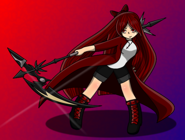 My OC Val dressed as Ruby Rose from RWBY. She's about to take a swing at someone with Crescent RoseCommission by twitter.com/ChibiTaylor