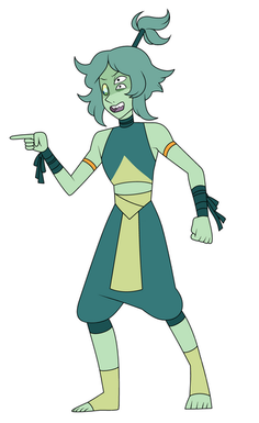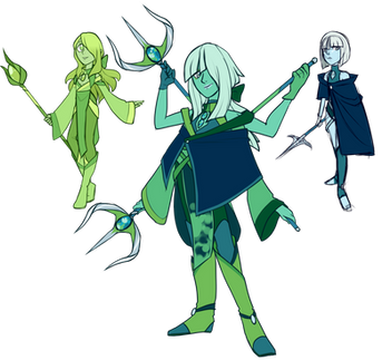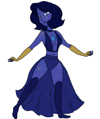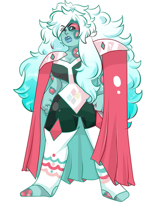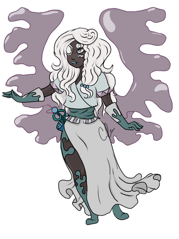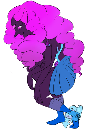 Salt was born into the court of Blue Diamond, a new kind of gem created to serve as a protector to the young Sapphire. She is a talented fighter and not afraid to pursue an enemy more powerful than herself. This gem posses electrical powers that manifest through her weapon and -occasionally- in sparks from her hair. When at court Salt is prone to standoffish behavior, making few friends. Her relationship with her Sapphire is very close and the two have been spotted laughing together. Salt is a good teacher and has become an instructor to other guards.