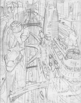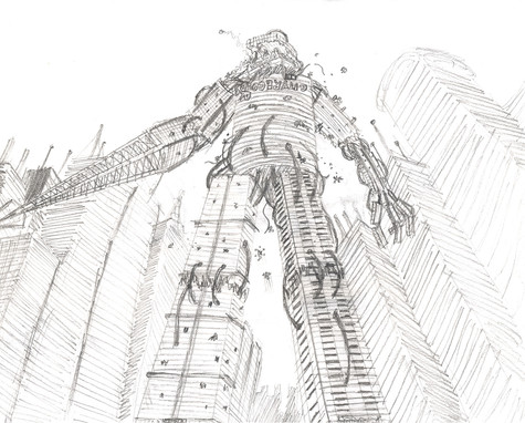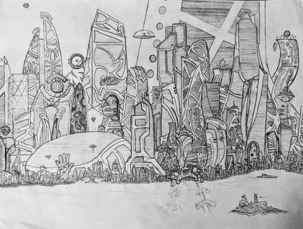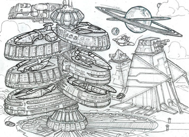 Its a view of the "Industrial Complex" (or settlement for the "workers" the ones constructing the planet) located in the "thumb" (see link) of the massive biomechanical entity. On the background is the work in progress planet "earth", plenty o hot stuffs such as volcanoes and no atmosphere yet. Further is the "mouth" of the entity which houses the core generator.