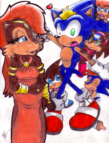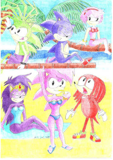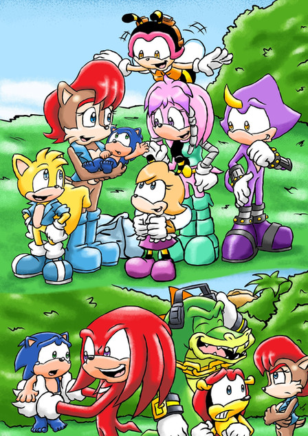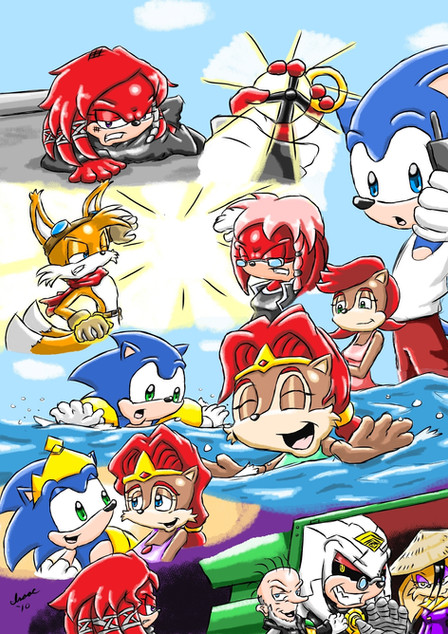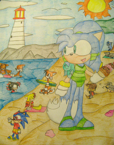 This is something that I was working with while finishing up Shadow and Amy's Family#10. Not much is going on in this pic but a relaxing day in the sun for Sonic's family and some of the fellow Freedom Fighters. Sonic is taking it easy while Sally sees both Sonia and Manik covering their father in a huge pile of sand. Tails and his family are at the beach as well. His wife Mina is sitting along with him while looking over their son Skye, who is making a sand castle. Their daughter Melody is quite enjoying the day as well. Bunny and Antoine are along for the occassion also, and appear to make the most out of the moment. There is also Rotor, who seems to be chilling under a tree while looking outward in the view. Last, but certainly not least, Lara Su is with the gang for some R and R like everyone else. Looks like every guardian needs a break from time to time. Originally, the pic was to be mainly with Sonic and his family, but I later decided to bring in some of the members of the Freedom Fighters. Anyway, here is a cool Sonic pic that many may like.