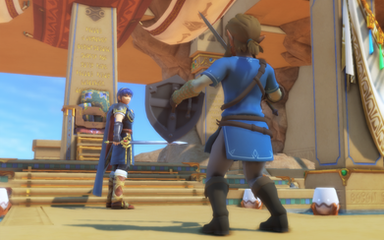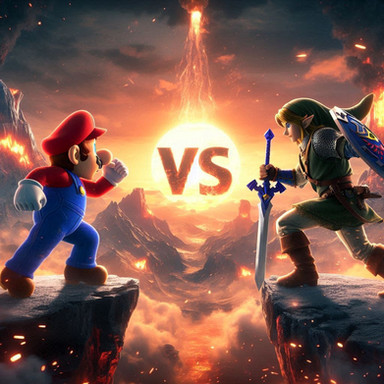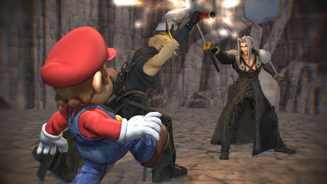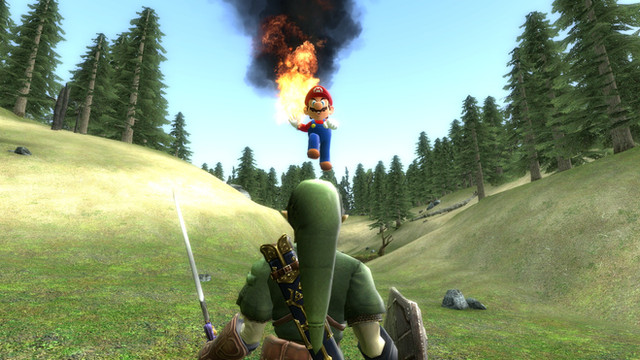 A false princess is defeated by Link and Yoshi, though Mario catches a glimpse of Peach's fake trophy disintegrating. Filled with anger that Peach may have been put down by Link, he comes to take revenge from a misunderstanding. This was rendered in Blender Cycles.