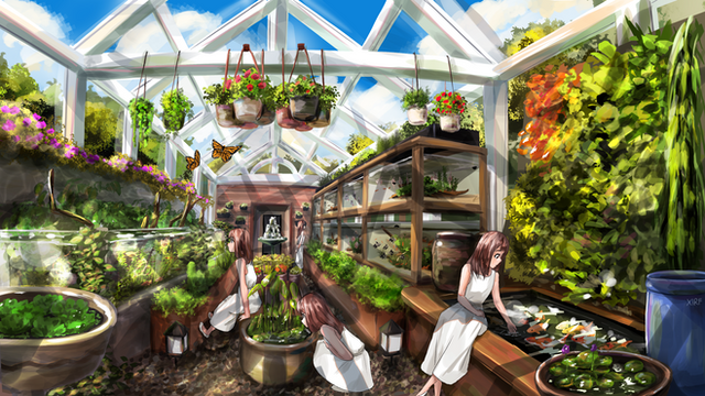 #animeart #animestyle #fantasy #fishtank #flowers #gardening #greenhouse #nature #plantlife #plants #stream #terrarium #solarpunk #cottagecore #conceptart #digitalillustration #succulents