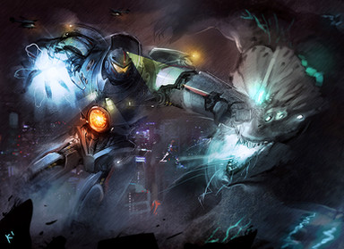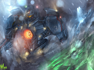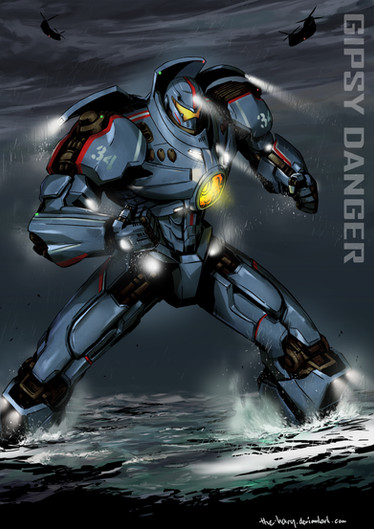 I think.... maybe a little more contrast on Gipsy Danger could help improve the piece, particularly around the yellow eyepiece or adding some deeper reds to the chest reactor. The yellow really draws the eye since the rest of the drawing has such a limited palette so every detail or flat part is brought to detail (does that make sense?) But thats really the only thing I can even think to critique, the proportions and composition are crazy fantastic. Plus Knifehead-chan is kawaii~