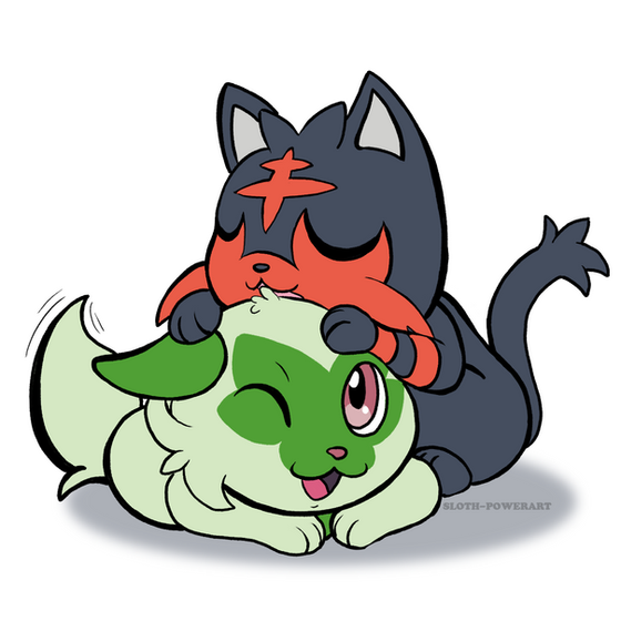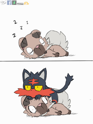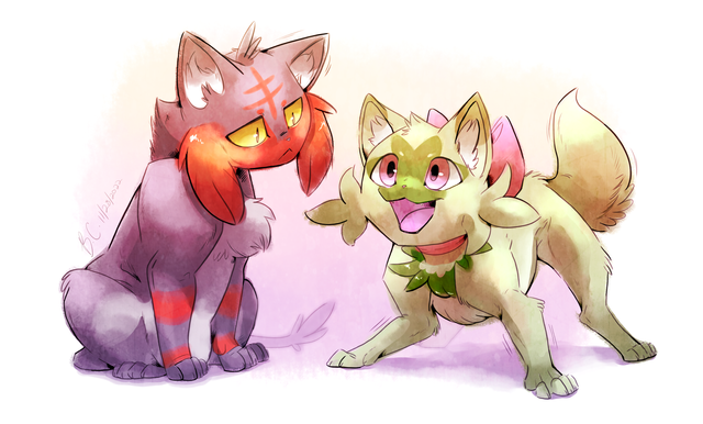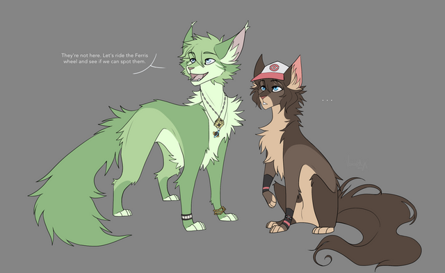 The characters here are Ray the Dusk Lycanroc (she/her) (Heavily considering changing her name since that's kinda become my secondary online name lately) and Caspian the Litten (he/him). They're some of the main characters in a mini pokemon story I have that I'm working on as such?? idk it's not a proper story, just a lot of world building and messy character development but I love it all the same.