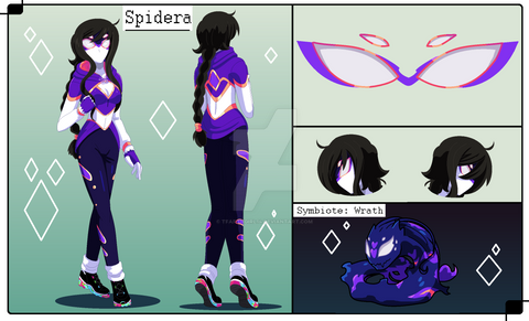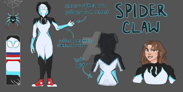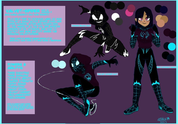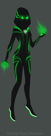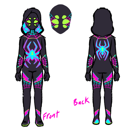 Her suit is completely black, apart from the glowing patterns on it. The patterns tend to pulse in a dull glow, that becomes brighter when she uses her powers, she can make it turn off. It glows brightest around the eyes and the centre of the spider pattern on her chest. Her suit is also water proof, and is made up of hundreds of thousands of little hexagon patterned material, it's not bullet proof. There is also no A.I inside the suit, as most of them don't anyway, only the current Tom Holland Spider-Man. Her lightning is often seen dancing around the glowing patterns on her suit, she does this for fun. her suit is also equiped with a "wing suit" which has blue transparent "wings" that fold out from the side, this allows her to glide. he webs are the same colour blue, they come out from the things on her wrists, the webs will glow blue if anyone or anything touches them, she can charge them with electricity making them a deadly weapon. he belt is kind of useless, but it has an attachable satchel that contains extra web shooters (she has extra ones in her web shooter clips anyway, it also contains any food and other stuff she wants to carry around.