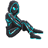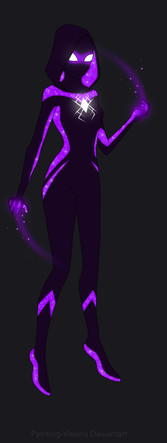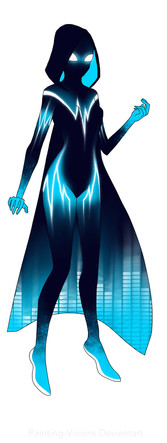 As a normal human: Katlin is a 18 year old girl who is in grade 12 at school, her parents don't really have many restrictions on her, so she can just go out and help stop crime and what not. She is also a bit of a rebel. She is into art, and music, often seen with a set of headphones and an iPod (her iPod happens to be the same colours as her suit. her headphones are black with a blue and white pulse pattern on them.) she has several piercings on on ear, often wears some form of studs in them. She has long black (or very dark brown hair) with blue/grey eyes. Her fingernails are often painted black. She has several silver rings on her hands and a necklace that she pretty much never removes, as well as a bracelet or two (she doesn't often wear all this stuff at once of course, she doesn't like to overdo it) she is mostly quiet and can be a bit edgy, but she is kinda popular at school and can be quite friendly at times, but she is more of an introvert, and doesn't really socialise much. She doesn't wear heavy makeup and too much black, even though it's her favourite colour, she often wears a black leather jacket with silver zips and bits, as well as a white or colourful t-shirt with denim jeans and black boots. She is also fond of hoodies.