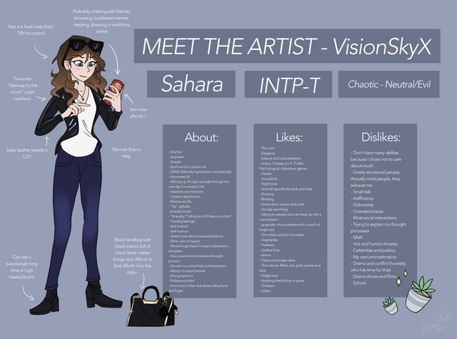 very much an introvert, quiet, serious, not easily entertained. kind, friendly, likes spending time alone but will happily spend time with others if invited, just a little bit edgy.