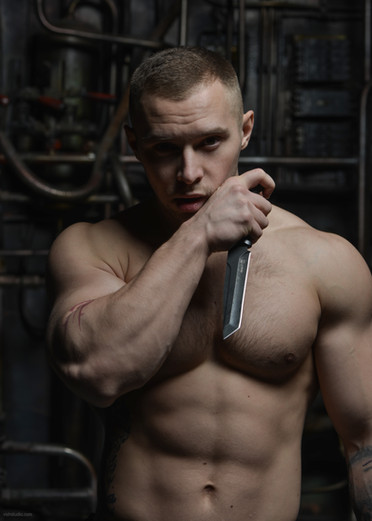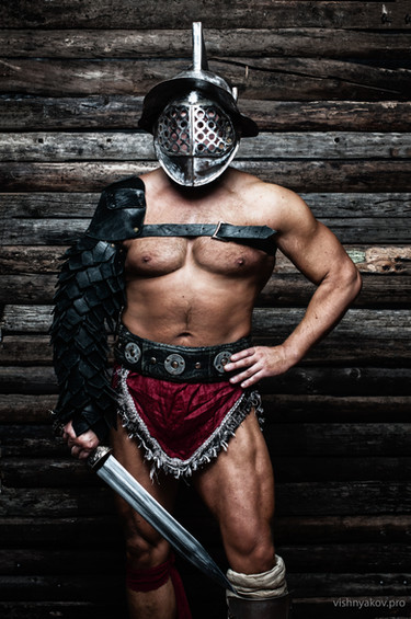 Another of my old time favorites, showing Vladimir in a Roman helmet. I've got three similar ones, (including one with a helmet bush with alternately dark and blond hair) and a so-called ‘lorica segmentata’ body harness too, I’ve done some posing shots in them, some years ago. I love this Roman body armour, as I like the Spartan helmets and (scarce) body wear too! Maybe you could call it some kind of a fetish? I’m not into re-enactment though.