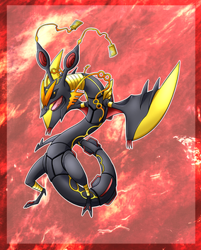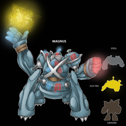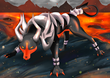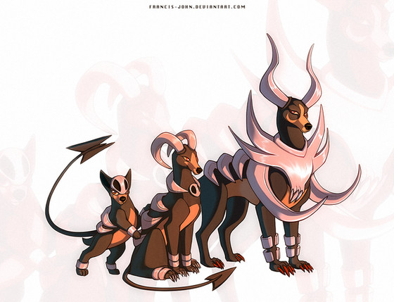 The partial inspiration was the Egyptian demon Ammit as he consumes the hearts of those demend unworthy of the afterlife, hence the guard dog aspect of his design. However I choose not to take a literal interpretation as this fusemon would incorporate hippowdon andΒ KrokorokΒ instead of aggron and houndoom.