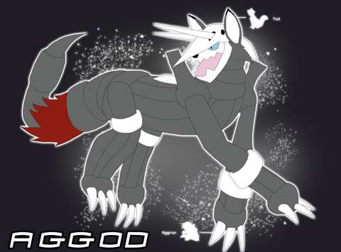 "An odd specimen this one. At first we did not think it would survive the first week outside of the tube, it refused to eat and hardly moved. We keep on it though, not being able to afford another failure. As we approached the end of week two there were still no signs of improvement and were afraid we would have to put it down if its condition did not improve with in the next few days. On day 2 of week three we went into its holding cell to put it out of its misery, yet when approached I approached it had the most curious reaction. It move it head slightly and opened its eyes for the first time in days. We all remained still and the weak beast made its way onto its feet and over to use, finally resting its head on our shoes. Surprised at the creatues passive nature and sudden will to live we pushed on for another another week. This time adding human and other pokemon interaction. It seemed to take to this new level of companionship and swiftly gained weight. The now dubbed 'Aggradoom' has taken well to life in the lab. To our surprise it seems to wish to assist us in the caring of our projects, a pleasant disposition for the creature to have despite its fierce looking appearance."