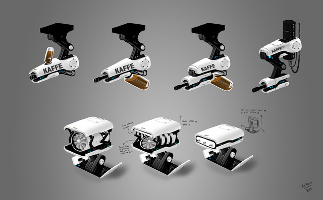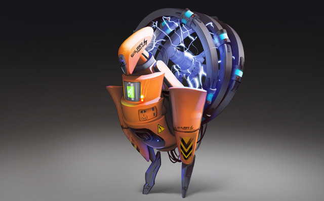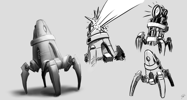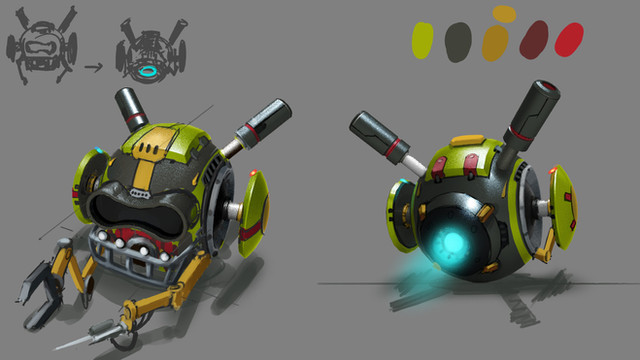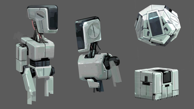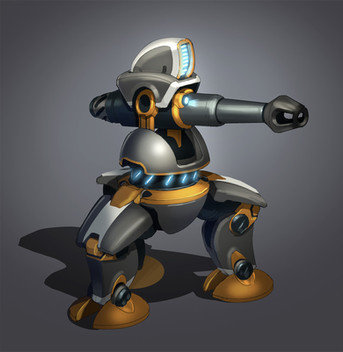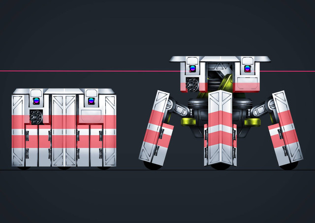 It`s a 'can' robot which, in compact mode, can be used as a laserline trap or enemy detection and is almost indestructible. The upper body rotates freely in every mode. In the open mode the can transforms into a real robot, that can move on four small tires (hidden behind massive armor plates) and well, see for yourself
