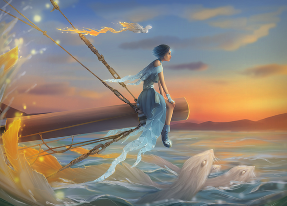 The first thing i notice is the happiness of the steed and the awe in the girl's face. Your work with the water is amazing and very realistic and fits perfectly with the rest of the piece. I love how you threw in the gondola in the background and the fish swimming around it's feet. Your vision with the clothing and how you perfectly shadow each fold is just astounding. Again i have you give you props, for the wonderful creature design. Everything flows in this piece and you've made it a story in a picture. It is a wonderful mix of fantasy and Venice, Italy.