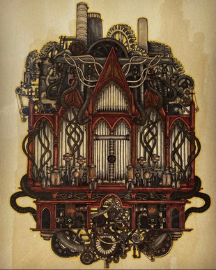 This whole piece has a lovely texture, what did you use to make it? I want to say colored pencils but I'm bot sure. It adds to the overall aged effect. I particularly like the pipe in the middle in middle that bulges forward, its a nice depth giving effect and the various pipes at the top. There's organ pipes, a chimney, and a water spicket. Very nice.