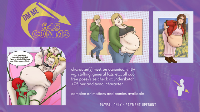 Hola hola , hoy les traigo mi tabla de comisiones para todos aquellos interesados en una buena panza , o ver a su waifu con un poco mas de grasa pueden decirme con gusto atendere a cualquiera