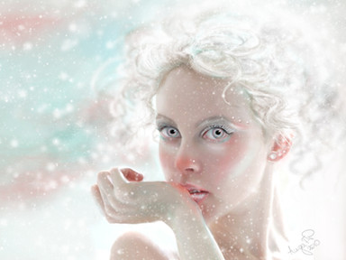 It's kind of unfair to say that this image is flawless, because I haven't seen all of DeviantArt's deviations yet, but I'm going to go out on a limb and say that it is. I love this piece, not only for it's purity and artistic excellence, but also for it's cut-trough design and visionary composition and concept. The color-scheme is breathtaking. The colors are few but very fitting, and the transitions and lights are very subtle. I especially like the 'fading' snowflakes and the green-grey, textured and fading background. You've successfully created a winter's sky. The girl in this piece is beautifully portrayed, as you've managed to keep her purity and innocence intact. I personally think she looks more thoughtfull than curious. The ice-colored face is so detailed and smooth that I have troubles collecting my thoughts. The makeup and the light/shadow-effects is stunning. I especially like her eye, and the way you've done her hair. The 'fur-edge' on her white hood is elegant and obviously very carefully created.