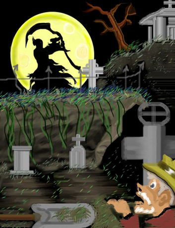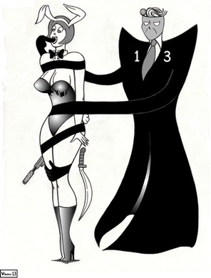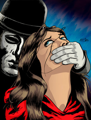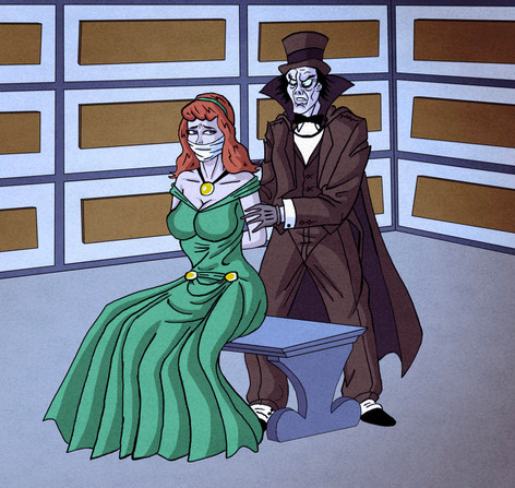 With the muzzles of the two .45's pressed to his head the mad doctor knew he had only one choice but to release Daphne to the Shadow. Dr. Slicer had wanted to catch Daphne and do some "work" on her, but now he could only use the knife to cut her bonds. "These meddling kids" he thought to himself.Β