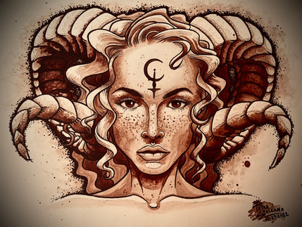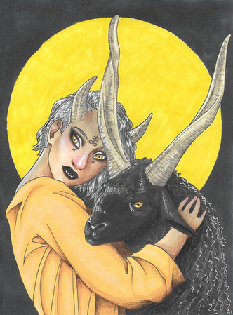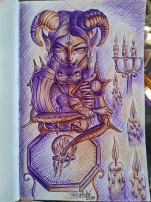 "Marbas" - 2021..ink and colored pencil.Marbas is a demon described as a Great President of Hell governing thirty-six legions of demons. He answers truly on hidden or secret things, causes and heals diseases, gives wisdom and knowledge in mechanical arts, and can change men into other shapes. He is depicted as a great lion that, under the conjurer's request, changes shape into a man.