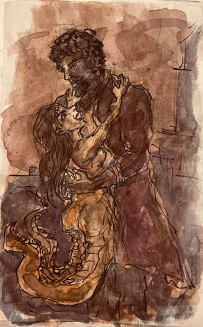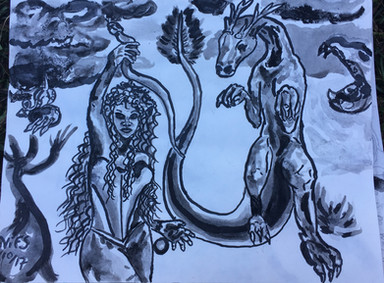 Ink and a little colored pencil on bristol paper 11"x14" It turns out that colored pencil and ink don't play together wellI had no idea what to call this. They're just kind of dangling there after swinging out of the trees. The half snake guy has been a recurring character lately. If it rains all weekend, there will probably be more of him soon.