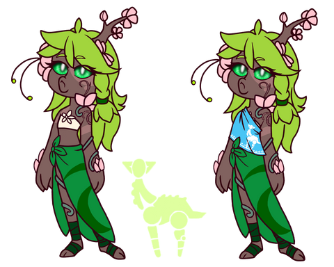 Dendrobius (Dee), named for her red eyes, that are red like Inazuma's Dendrobium!The bow for my Dendro Yaksha! Dreaming Meadow - A specifically crafted bow that was gifted to a young Yaksha by her father. It contains the hopes and dreams, and positive energy of her parents. The little Yaksha can also pluck and strum tunes to her heart's content, her songs seem to ease her still developing mind when she worries and ponders! Dee goes by a nickname because she really dislikes being overly formal! She took up residence near Wangshu Inn, where she planted a rare tree that would bloom a pure white color like silk! Eventually this tree was noticed by the Conqerer of Demons, Xiao, and he went to investigate.