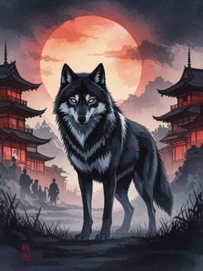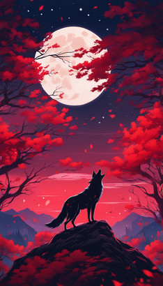 #abstractart #abstractartwork #abstractdigital #adoptable #ai #bloodmoon #darkfantasy #digitalart #digitalpainting #exclusive #fantasyart #fantasyillustration #japanese #moon #mountains #redmoon #temple #wolf #wolfcharacter #darkfantasyart #wolfadoptable #wolfcanine #adoptadoptable #glowing_effect #aigeneratedart