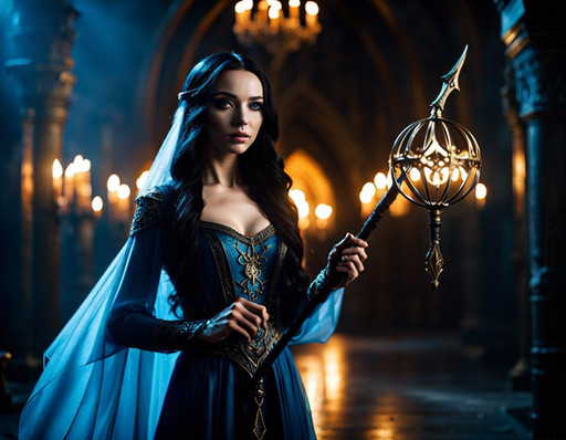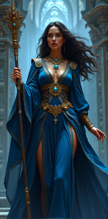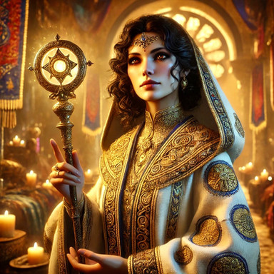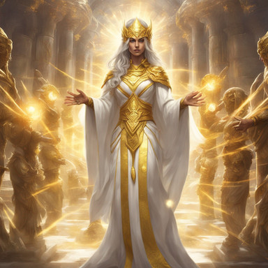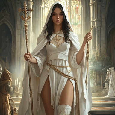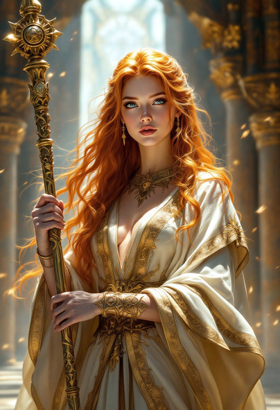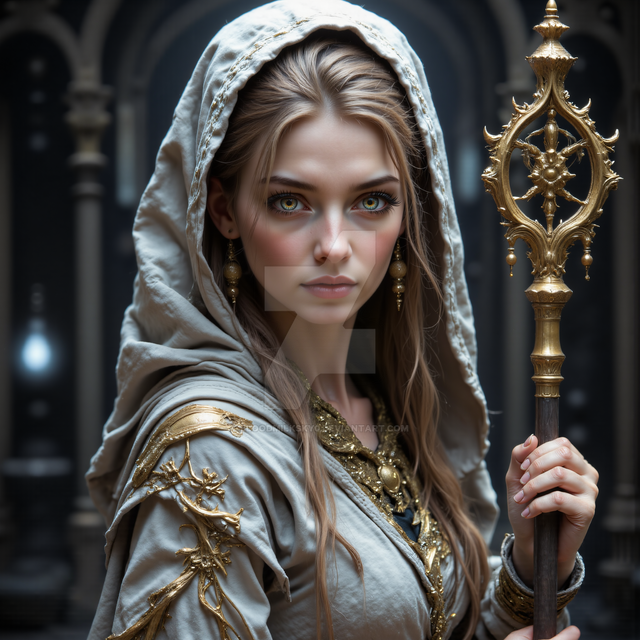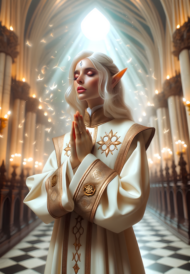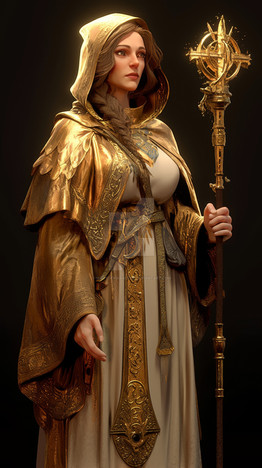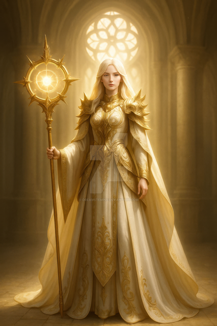 #ancient #blessing #cathedral #divine #followers #gemstone #glowing #halo #magic #medieval #ornate #priestess #ritual #robe #staff