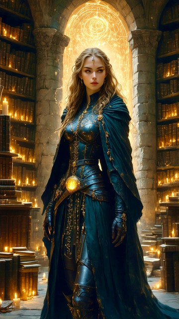 #digitalart #magic #fantasyart #ai #ancient #armor #blonde #books #elegant #eyes #fantasy #glowing #golden #jewelry #library #mystical #ornate #powerful #regal #robe #runes #sorceress #woman #magicalcolors