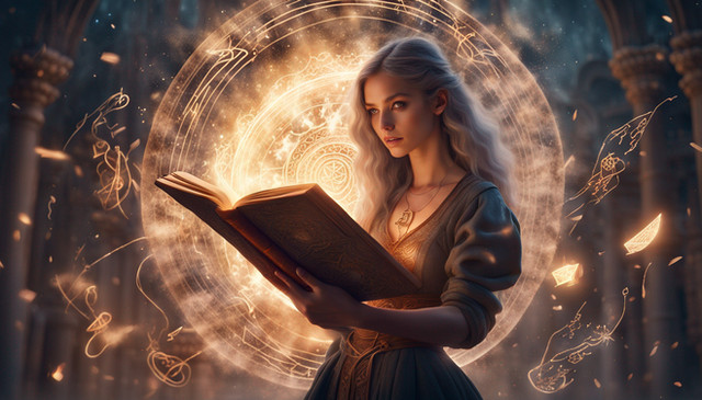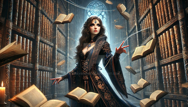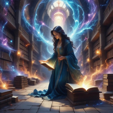 #ai #blue #book #candles #carving #curious #enchanted #glow #hair #library #magic #silver #sparkles #stars #woman #wood