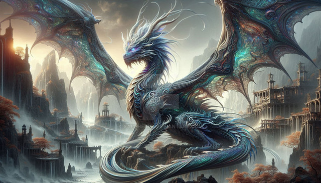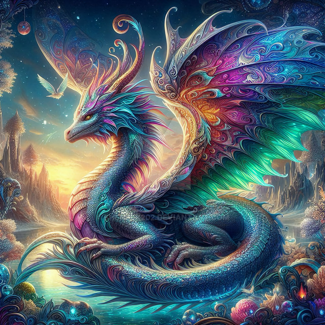 #ai #blue #castle #clouds #dragon #enchanted #forest #green #horns #iridescent #jewels #lake #majestic #mystical #princess #purple #scales #sky #tiara #waterfall
