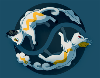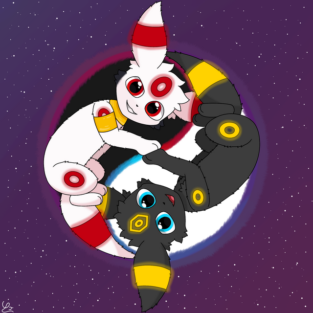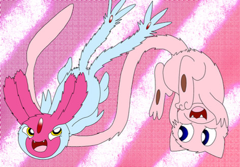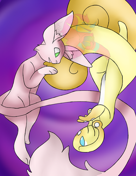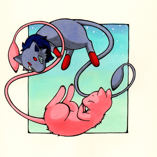 Heya. Okay so this is a doodle of two of my characters, Hope and Despair, pictured together in Mew form. I honestly like how this came out, especially considering I originally just drew Hope then made Despair off of the Hope doodle. Honestly low key proud of it lol