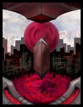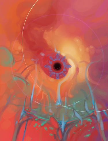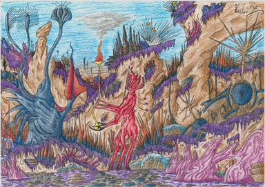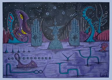 I've pretty much abandoned doing art for the sake of worldbuilding, which means this piece is its own story! I didn't plan this out all too much, just sort of drew things as my subconscious brough them up. The only major ideas I got, which are the centerpieces of the painting, are the play on sea and land and the puppet show going on in the center.