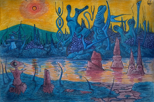 #alienplanet #landscape #sea #alien #aliencreature #digitalart #fantasy #marionette #painting #puppet #robot #sunset #surrealart #surrealism #theater