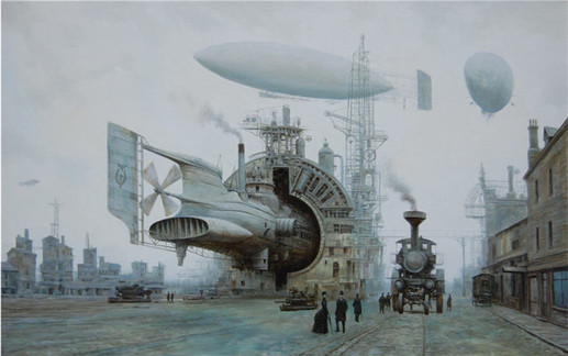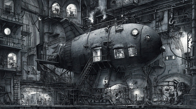 it's a freakin' pity that the resolution of this image is so small. The picture is astonishing, I would love to have it on a wall of my house. The atmosphere is delightfully steampunk with a great taste. Detailed, yet not too much, as to keep the clear feeling of a traditional painting. Definitely a piece of art.