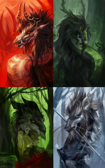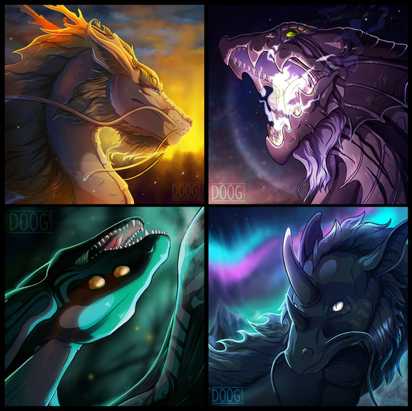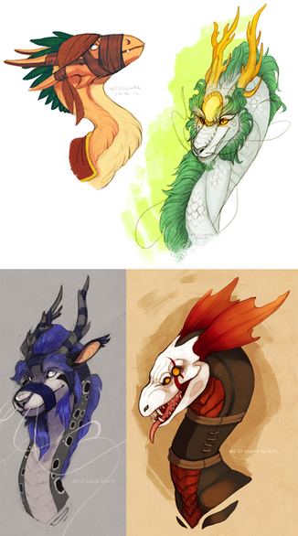 Little image bundle of yet again few Flight Rising Dragons. From left to right the dragons are Kei, Shale, Spellwhipper and Valkea.