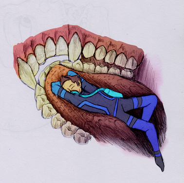 I love this. <3 I love the touch with the uvula squished up on top of his head. XD And it looks nice and soft in there.