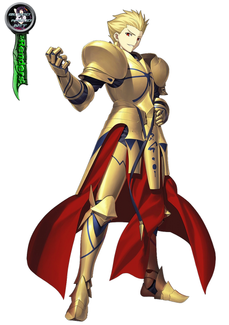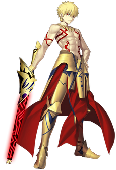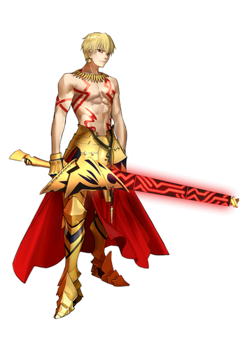 The great half-god, half-human King of Heroes GILGAMESH born from the union between the King of Uruk, Lugalbanda, and goddess Rimat-NinsunWP. He ruled the SumerianWP city-stateWP of Uruk, the capital city of ancient MesopotamiaWP in the B.C. era. He was an ultimate, transcendent being so divine as to be two-thirds god and one-third human, and no others in the world could match him. He was a despotWP possessing high divinity who believed he was invincible. He is not merely a legend, and is said to have actually existed and ruled during the Sumer DynastyWP five thousand years ago. He was the King of Heroes (英雄王, Eiyū-Ō?) who possessed all things in the world, whose tale is recorded in mankind's oldest epic poem, the Epic of GilgameshWP which portrays Gilgamesh as a hero, destined to be king and achieve great feats, who is driven to meet his destiny, facing challenges together with his best friend Enkidu.